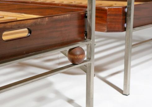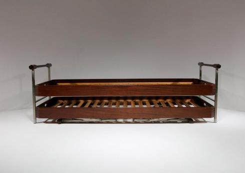 Top bed hosts a lower one that slides on wood wheels and becomes a twin daybed.