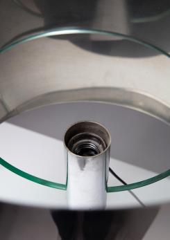A thick glass element supports a chrome shade and a metal base.
