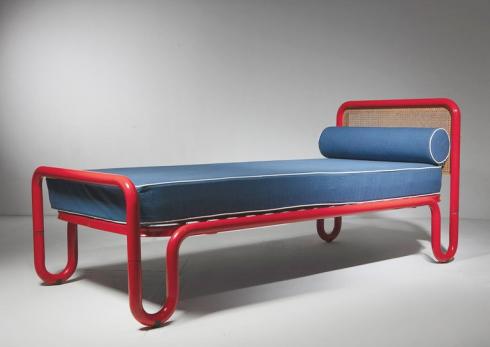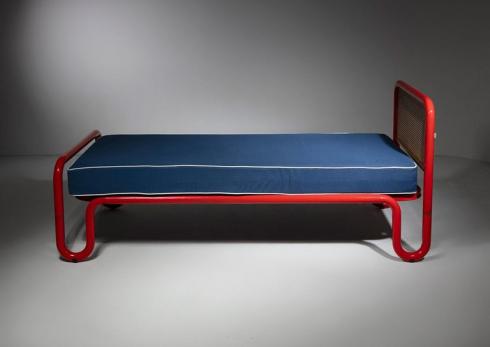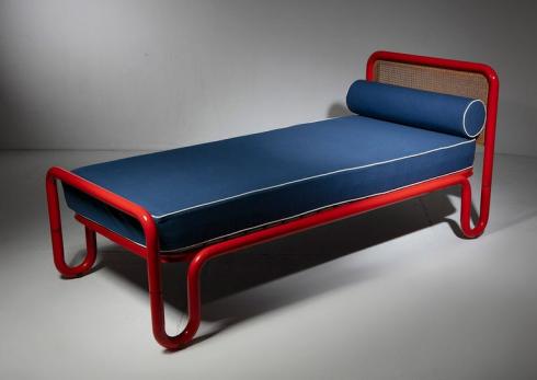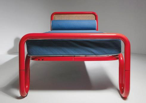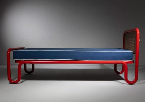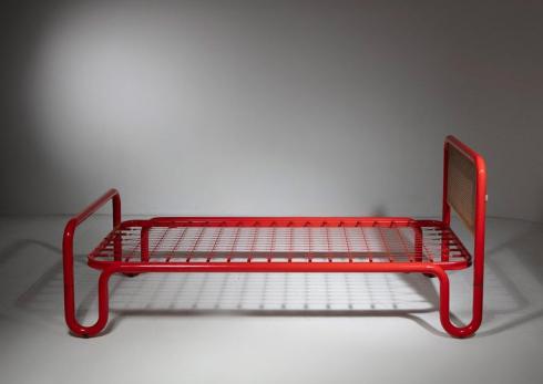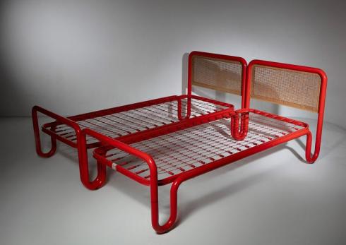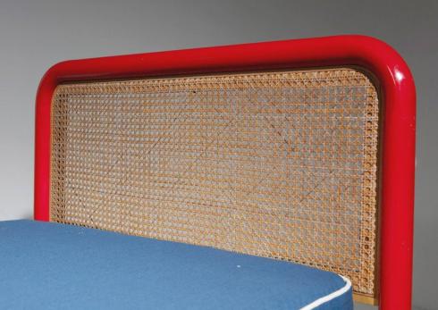 Bold red metal pipe frames and cane headboards.
