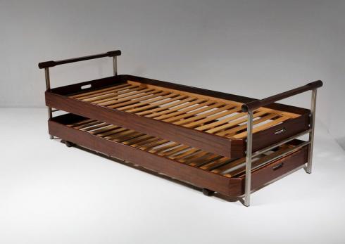 Top bed hosts a lower one that slides on wood wheels and becomes a twin daybed.